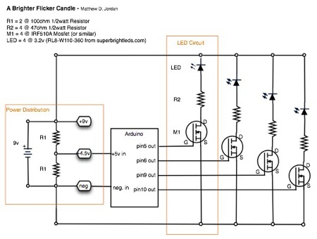 This setup is powered by a single 9 volt battery. Notice the power distribution part of the schematic? The voltage is divided into two different values to feed different components of the effect. The Lily pad is powered by the 4.5 volt leg, while the LEDs are driven by the 9 volt leg. The max input voltage of the Lilypad is 5v; any more and you will fry its little brain (also note that if you cross the positive and negative power inputs of the Lilypad, it will short out.) Each candle unit utilizes four 360 degree white LEDs (you can find them at Superbrightleds.com.) Note that the LEDs can only withstand a maximum of 3.3 volts. The resistors (R2) in series with the LEDs drop the voltage to below the 3.3v maximum. Each LED is controlled via a different Lilypad output, allowing the LEDs to flicker independently of each other.